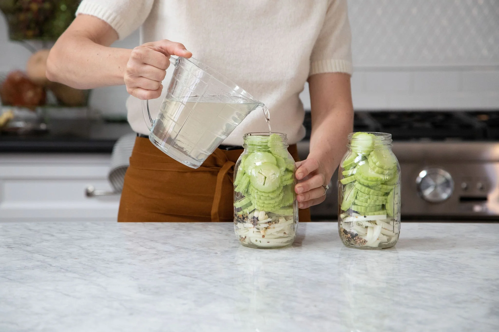 Pour in the chilled brine, covering the veggies entirely.