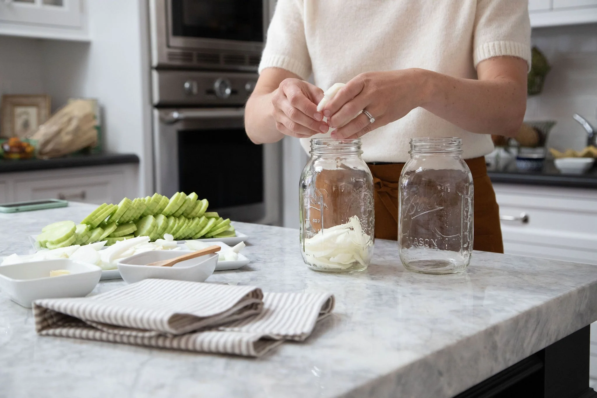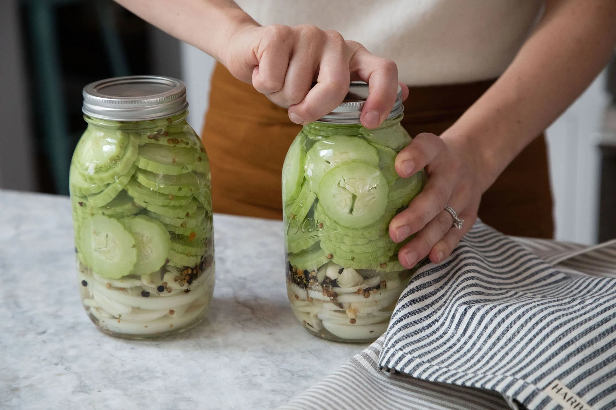 Tightly pack two 1-quart jars by layering in sliced onions, garlic, coriander seeds, mustard seeds, red pepper flakes, cucumbers, and dill sprigs. (The dill we had went to seed so we skipped that. You can also use a premixed “pickling seasoning” from a local store.)